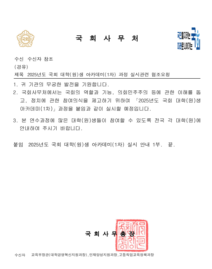[일반] 2025학년도 국회 대학(원)생 아카데미(1기) 과정 안내