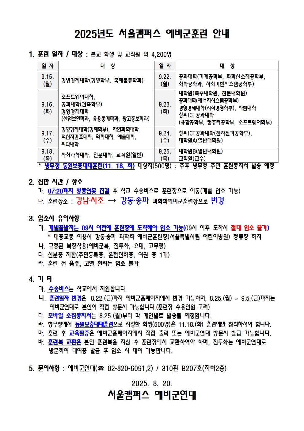 [일반] 2025년도 서울캠퍼스 예비군훈련 안내