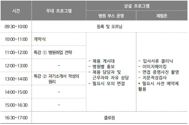 ※ 프로그램은 기관의 사정에 따라 변경될 수 있습니다. ※ 참석자 전원 기념품 증정 ※ 부스 방문 스탬프 릴레이를 통해 베이커리 및 경품 증정 ※ 채용공고 게시판 운영 – 참여의료기관 정보를 확인 할 수 있는 게시대 |