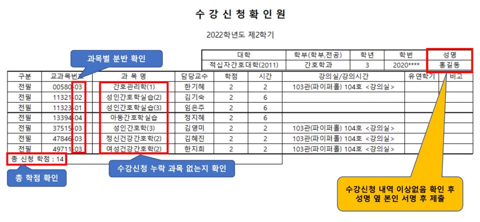 수강신청 누락 및 오류사항을 수강신청 정정기간(9/1~9/7)에 수정하신 후 (기 공지됨 “2025학년도 2학기 간호학과 수강신청 유의사항 안내” 게시글을 참고) 최종 수강신청 내역 이상 없음을 확인한 후 수강신청확인원에 본인 서명하여 제출하여 주시기 바랍니다.