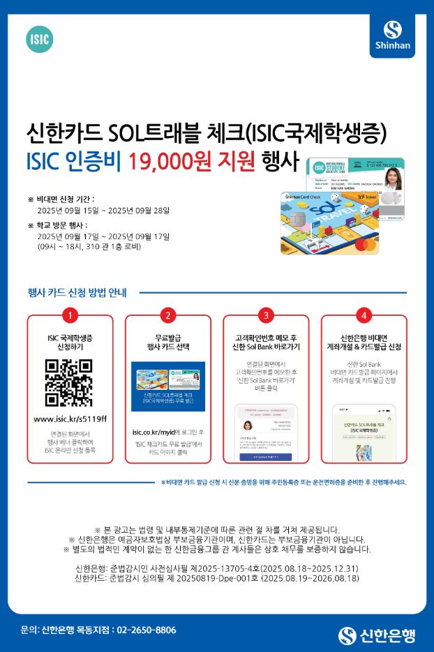 [일반] [ISIC국제학생증] 신한카드 SOL트래블 체크 ISIC인증비 19,000원 지원행사