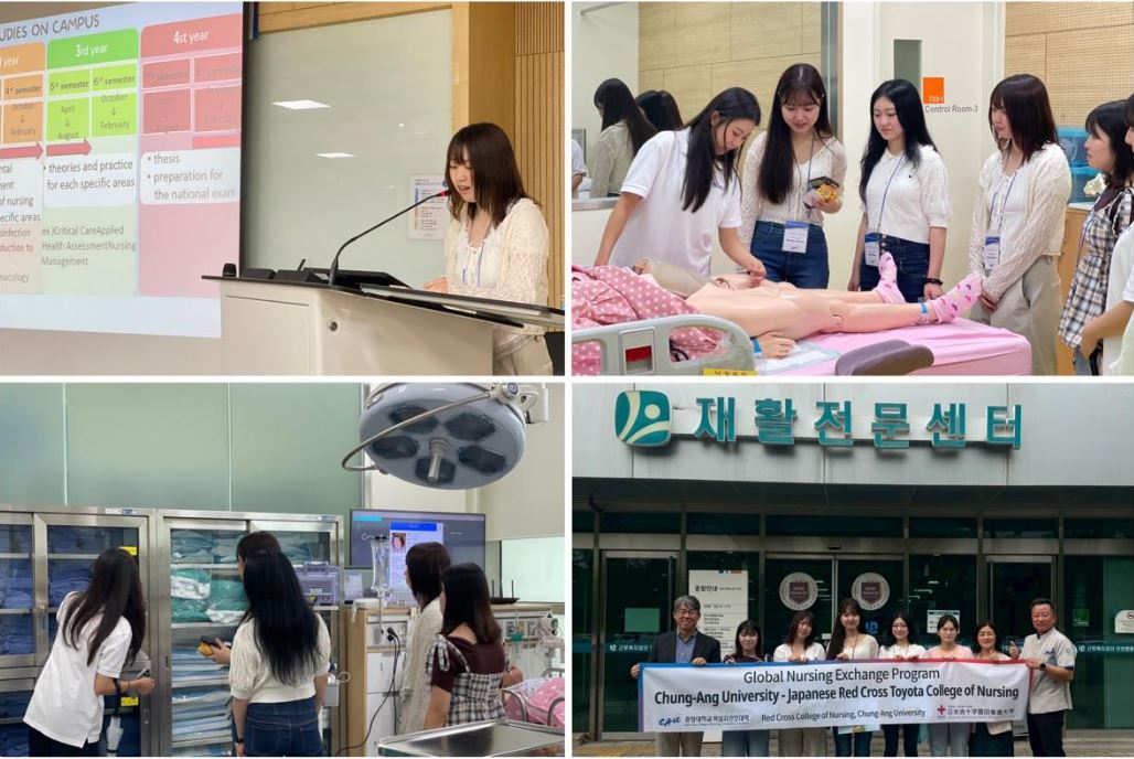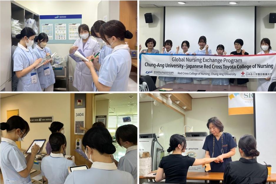 지난 9월 17일부터 23일까지 일본 도요타 적십자 간호대학(Japanese Red Cross Toyota College of Nursing) 학생 4명으로 구성된 방문단이 중앙대학교 간호학과를 찾아 한국의 간호교육과 보건의료 현장을 직접 경험하는 국제교류 프로그램을 진행하였다. 이번 교류를 통해 방문단은 다양한 임상 실습 환경과 보건의료 기관을 둘러보며 한국의 간호교육 체계와 의료 시스템을 깊이 있게 이해할 수 있었다. 또, 프로그램 기간 동안 널리 단원들과 함께 교내・외 활동을 함께하며 교류를 이어갔다. 학문적 교류와 더불어 문화적 체험까지 함께한 이번 일정은 양국 간호학과 학생들이 서로의 문화를 공유하는 의미 있는 시간이 되었다. 통합간호실습센터 투어 및 근로복지공단 인천병원 견학 9월 17일 열린 환영식에는 장숙랑 학장, 손연정 학과장을 비롯한 간호학과 교수진이 참석하였다. 장숙랑 교수는 “기간은 길지 않지만 밀도 높은 일정으로 좋은 경험을 하고, 간호학과 학생들과도 교류하는 시간이 되길 바란다.”라는 인삿말을 전했다. 이어 중앙대학교 간호학과 홍보대사인 널리(Nurly) 단원인 차정아, 최인아 학생이 학교와 학과를 소개했으며, 방문 학생들은 도요타 적십자 간호호대학의 커리큘럼과 캠퍼스 생활에 대해 이야기하는 시간을 가졌다. 이후 중앙대학교 캠퍼스 투어가 이어졌다. 학생들은 간호학과 역사관을 포함한 103관, 통합간호실습센터, 중앙도서관, 310관을 둘러보았다. 이어서 도요타 대학 방문단은 근로복지공단 인천병원을 방문해 수중 재활치료 시설을 둘러보는 시간을 가졌다. 한 학생은 “일본 병원에서는 수영장이 있는 곳이 거의 없는데, 바닥이 내려가며 휠체어 환자도 쉽게 재활치료를 받을 수 있는 시설이 매우 인상 깊었다.”라는 소감을 전했다. 18일에는 최귀순 교수와 함께 중앙대학교 광명병원을 투어하며 병원 곳곳을 둘러보았다. 14층 VIP 병동 ▲11층 노인 병동 ▲4층 당일 수술센터와 1인실 ICU ▲2층 신속대응팀 ▲1층 심장·뇌혈관센터 및 신경기능검사센터까지 살펴보며 최신식 병원 시스템과 환자 중심 설계를 직접 확인했다. 이어 서울 적십자병원을 방문해 한국의 공공의료 현장을 접했다. 학생들은 “일본의 적십자병원은 민간 기부로 운영되지만 한국은 국가 지원을 기반으로 운영된다는 점에서 두 나라의 차이가 신선했다”고 전했다. 같은 날 저녁에는 널리 단원들과 식사를 하며 즐거운 시간을 보냈다.