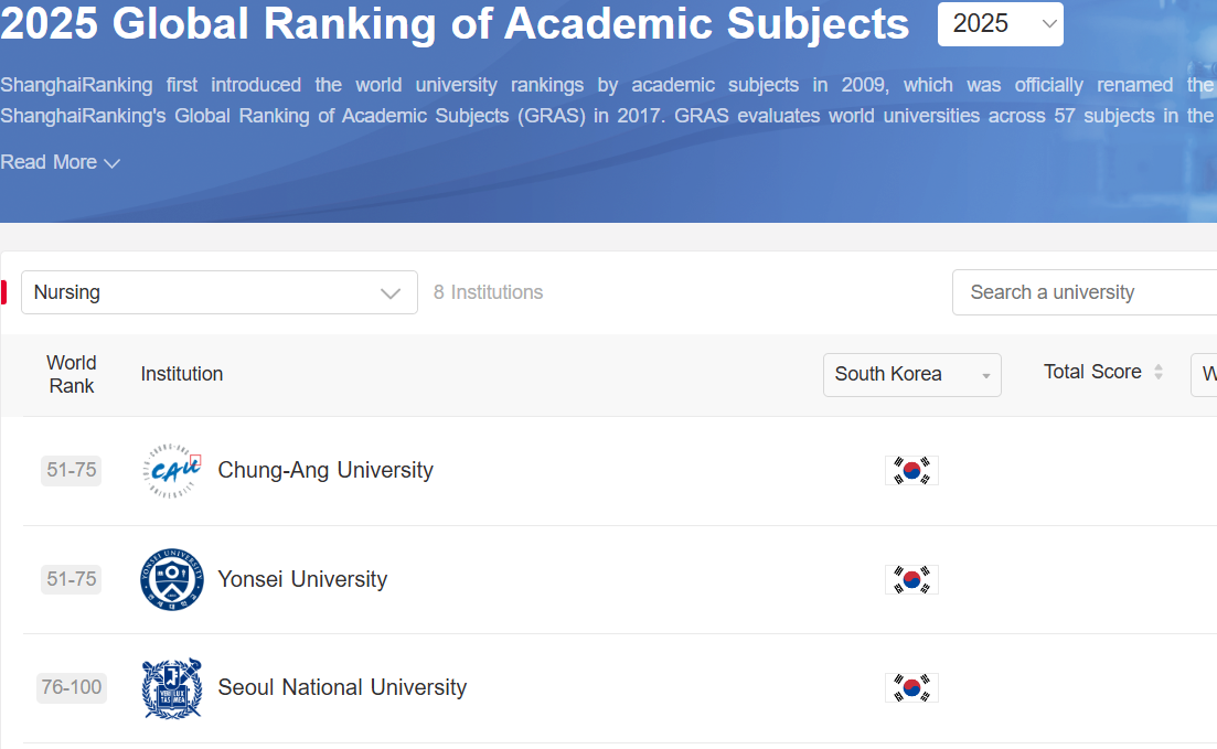 중앙대 간호학과, 2025년 상해교통대 학문분야평가(GRAS)에서 세계 51-75위, 국내 1위 기록